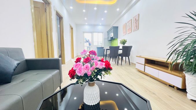 Nội thất căn hộ bao gồm: Sàn gỗ, hệ thống tủ bếp, nóng lạnh, điều hoà, giường tủ, bàn ghế – Nhà sạch sẽ…